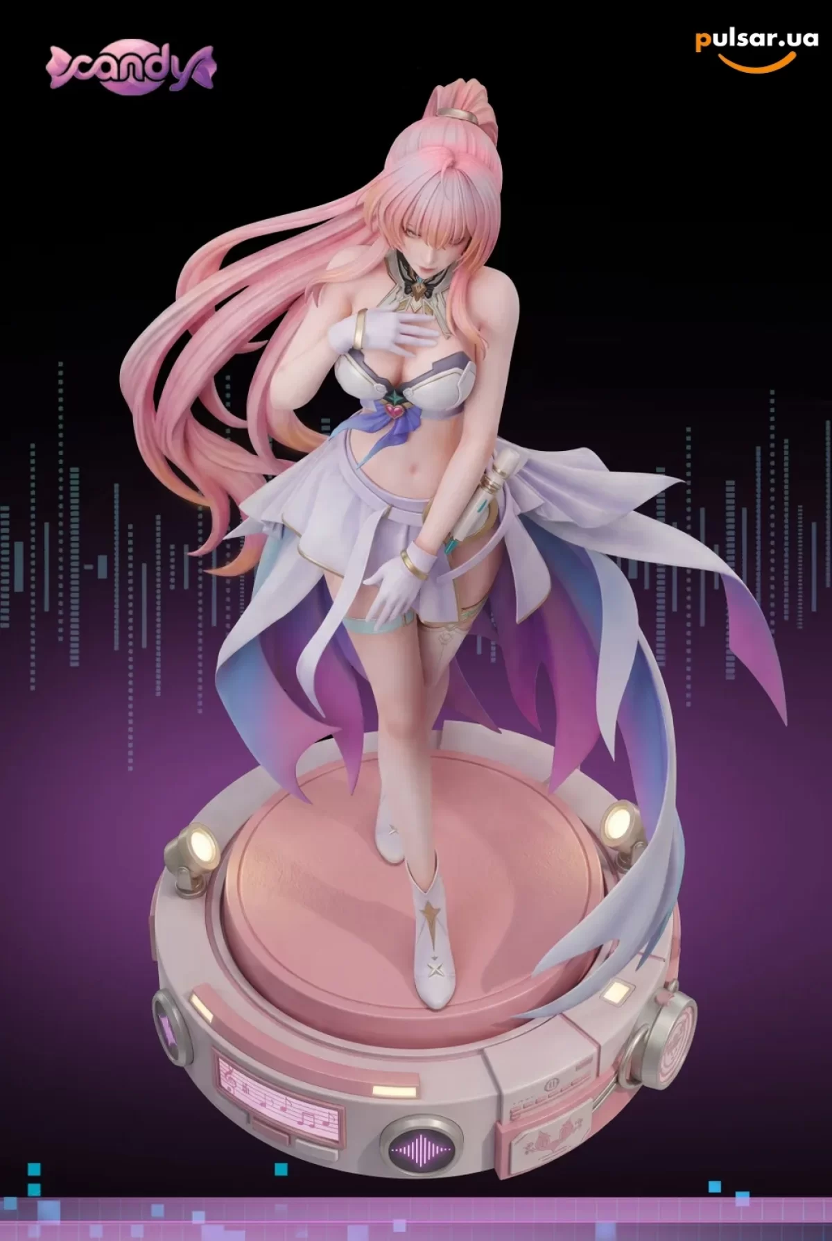 Скульпторы Candy Studio вложили всю душу в передачу динамики и характера героини. Девушка запечатлена в грациозной, изящной позе, словно она только что завершила свой смертоносный танец на поле битвы и прислушивается к затихающим вибрациям поверженных врагов. Ее роскошные, струящиеся розовые волосы образуют великолепный визуальный шлейф, поддерживая иллюзию движения. Боевой наряд Аэмис заслуживает стоячей овации: асимметричная юбка с плавным, градиентным переходом от белоснежного к глубокому фиолетово-синему оттенку выглядит невероятно воздушно. Обтягивающий белый топ с металлическими вставками, элегантные сапожки с золотыми звездами и тонкие ремешки на стройных бедрах подчеркивают ее соблазнительную фигуру, не переходя грань вульгарности.