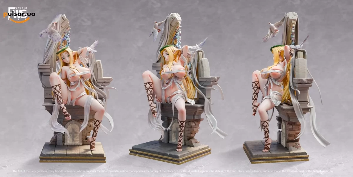 Мрачная вселенная Kuroinu славится своей бескомпромиссной жестокостью и эстетикой темного фэнтези. В центре этого лора находится Селестина Люкросс — некогда могущественная эльфийская принцесса, возглавлявшая рыцарский альянс против армий наемников. Бренд FWS Studio увековечил самый драматичный эпизод ее истории — момент полного сокрушения и пленения в захваченном соборе. Эта диорама не просто изображает персонажа, она передает тяжелую атмосферу отчаяния и поверженного величия. Массивная композиция формата Garage Kit (GK) представляет собой сложную многоуровневую сцену с полуразрушенным готическим троном, которая станет абсолютным смысловым центром притяжения взглядов в любой профильной R-18 коллекции.