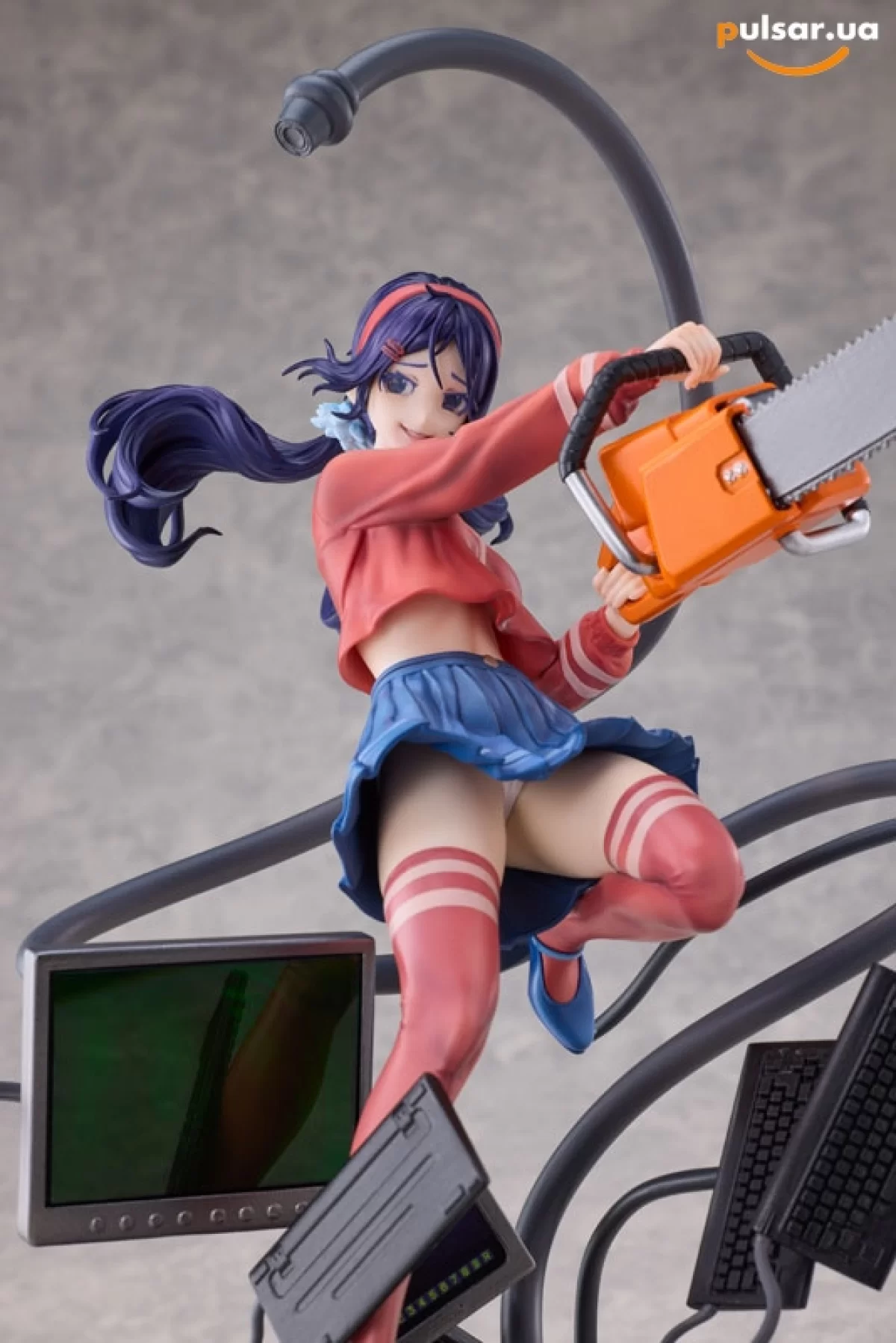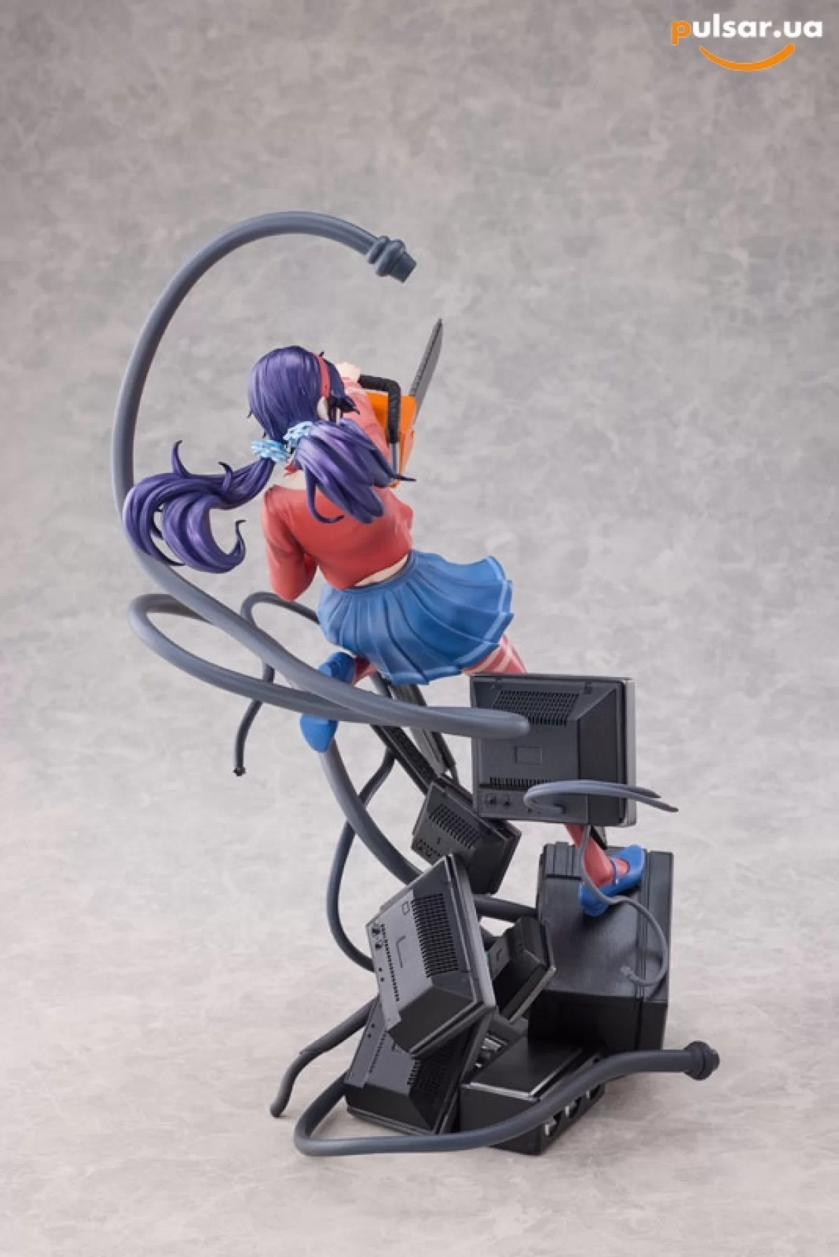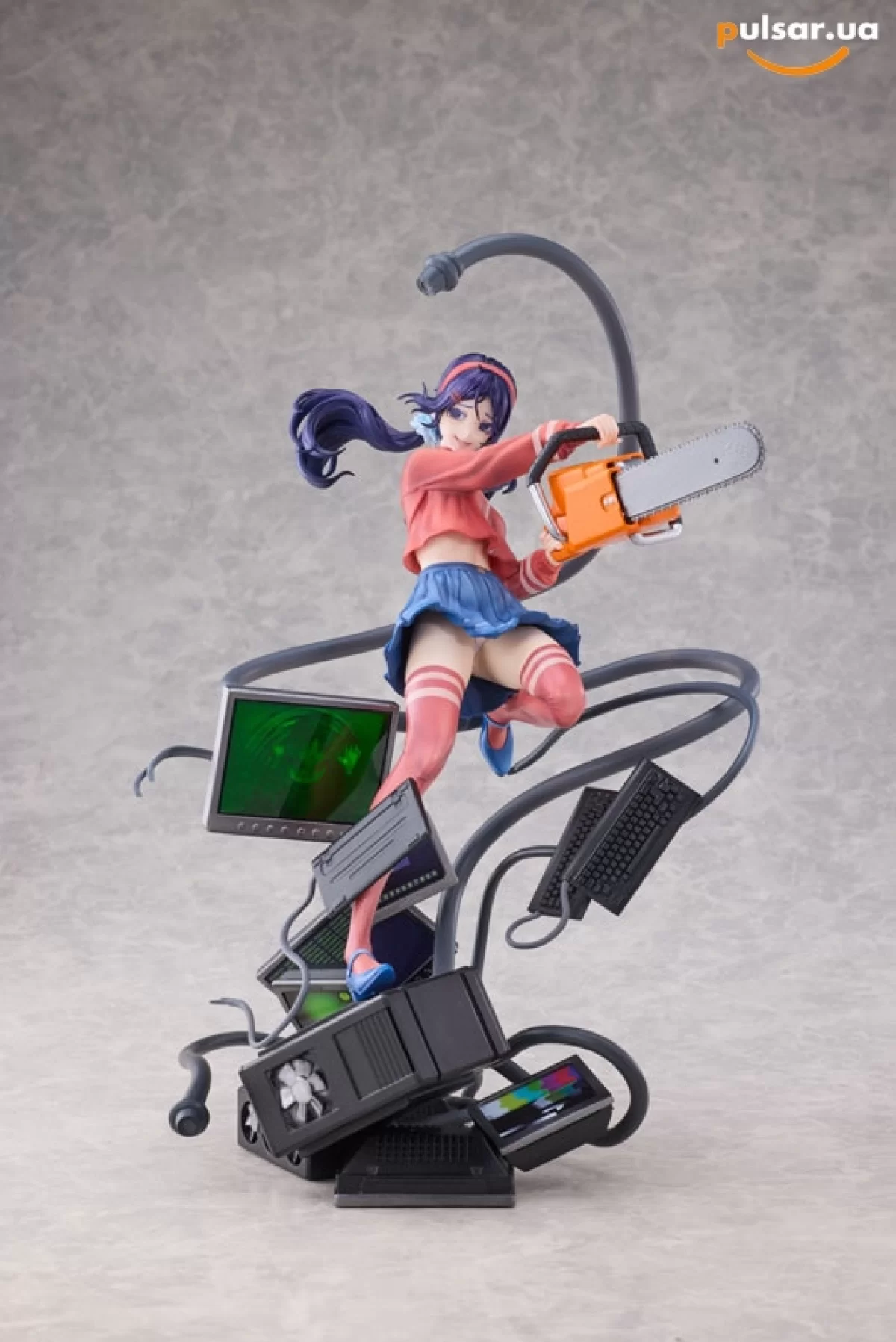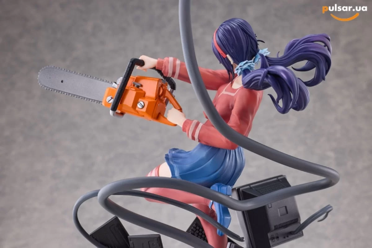• Сюжетная диорама высочайшего уровня: Данная фигурка — это не просто персонаж, а полноценная сцена из игры. Мита запечатлена в динамичном прыжке, сжимая в руках массивную бензопилу. Её окружают хаотично разбросанные элементы компьютерной техники: мониторы с помехами, системные блоки и клавиатуры. Из основания вырываются зловещие черные кабели-щупальца, которые оплетают технику, создавая ощущение живого, агрессивного цифрового организма.