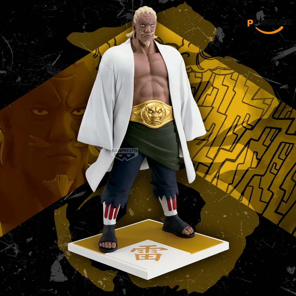 Скульпторы японской компании Banpresto проделали поистине колоссальную работу, чтобы с маниакальной точностью перенести на эту статуэтку тяжелую, подавляющую ауру Четвертого Райкаге. Каждая мельчайшая деталь его каноничного дизайна проработана с максимальным вниманием к первоисточнику. Мускулатура Эя вылеплена настолько реалистично и рельефно, что можно рассмотреть напряжение каждого отдельного мускула на его широкой груди и стальном прессе. Особого внимания заслуживает его классический наряд: традиционный белоснежный плащ (хаори) предводителя деревни накинут на его массивные плечи, а огромная золотая пряжка чемпионского пояса, символизирующая его статус, детализирована до мельчайших гравировок. Обратите внимание на важнейший исторический нюанс дизайна этой композиции: левый рукав его плаща пуст. Фигурка демонстрирует Райкаге после его легендарного и разрушительного столкновения с Саске Учихой на Совете Пяти Каге, где Эй, не колеблясь ни доли секунды, хладнокровно пожертвовал своей левой рукой, пораженной неугасимым черным пламенем Аматерасу, ради нанесения смертельного удара. Лицо Эя с его характерными светлыми волосами, усами и бородой выражает абсолютную суровость и непреклонность, а завершает композицию специальная квадратная база-подставка, на которой гордо красуется стилизованный кандзи «雷» (Рай / Молния), подчеркивая его стихийную принадлежность и высокий титул.