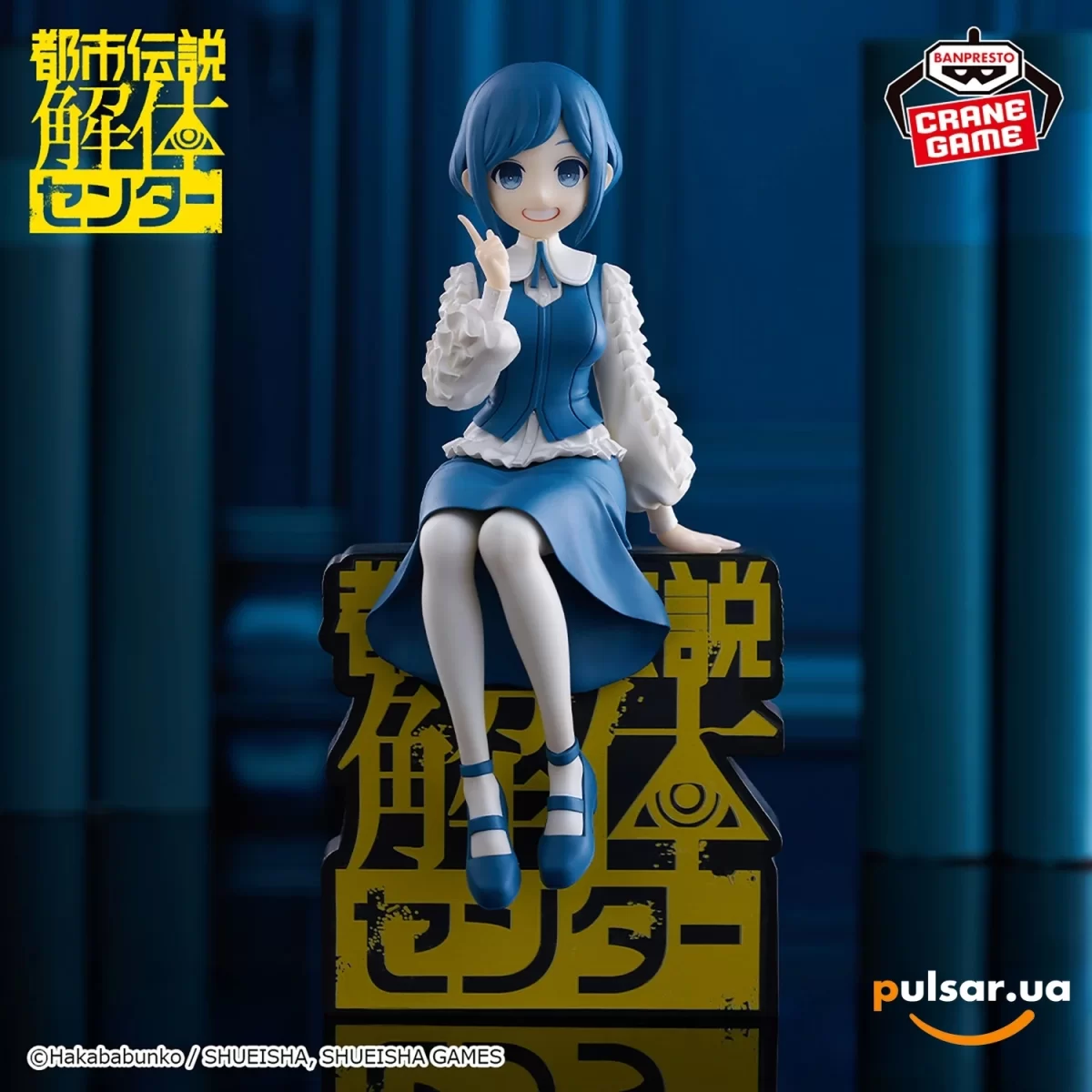 Талантливые мастера из компании Banpresto в очередной раз демонстрируют свое потрясающее умение оживлять рисованных персонажей в пластике, и фигурка Азами Фукураи стала истинным украшением их новой линейки. Героиня запечатлена в очень характерной для неё игривой и дружелюбной позе: она сидит, изящно сложив ноги и прижав палец к щеке, словно делится с вами очередным секретом или только что нашла важную зацепку в деле о городских легендах. Дизайнерам удалось мастерски передать все нюансы её сложного и эстетичного образа. Азами облачена в элегантное синее платье с белыми пышными рукавами, украшенными множеством изящных рюшей и оборок. Контрастное сочетание глубокого синего цвета и белоснежных деталей создает очень приятный визуальный акцент. Её ярко-синие волосы, уложенные в аккуратную стрижку каре, идеально гармонируют с цветом глаз и платьем. Скульпторы великолепно поработали над лицом героини, передав её искреннюю, широкую улыбку и живой, любознательный взгляд. Нижняя часть композиции представляет собой массивный стилизованный логотип игры с японскими иероглифами и символом всевидящего ока, выполненный в фирменных желто-черных тонах. Эта база не только служит надежной и устойчивой опорой, но и является важным элементом дизайна, мгновенно погружающим в атмосферу кибер-детектива.
