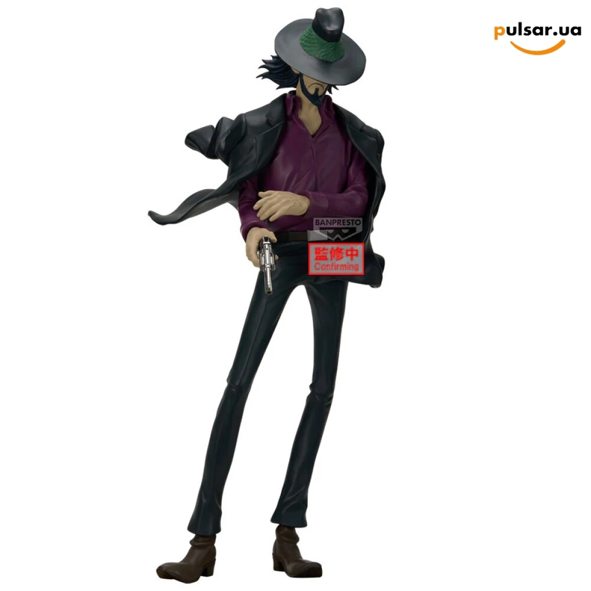 Цей Дзіґен виконаний у стилістиці серії фільмів "LUPIN THE ⅢRD" (як "Могила Дзіґена Дайске"), що відрізняється більш похмурим, дорослим та різким дизайном порівняно з класичним серіалом. Він стоїть у розслабленій позі, з насунутим на очі капелюхом, випромінюючи крижаний спокій професіонала. Темно-фіолетова сорочка, чорний костюм та револьвер напоготові — це еталонний образ. Ми в Pulsar знаємо, як рідко виходять гідні фігурки по "Люпену", тому особисто простежимо, щоб цей крутий хлопець дістався до вас без пригод!
