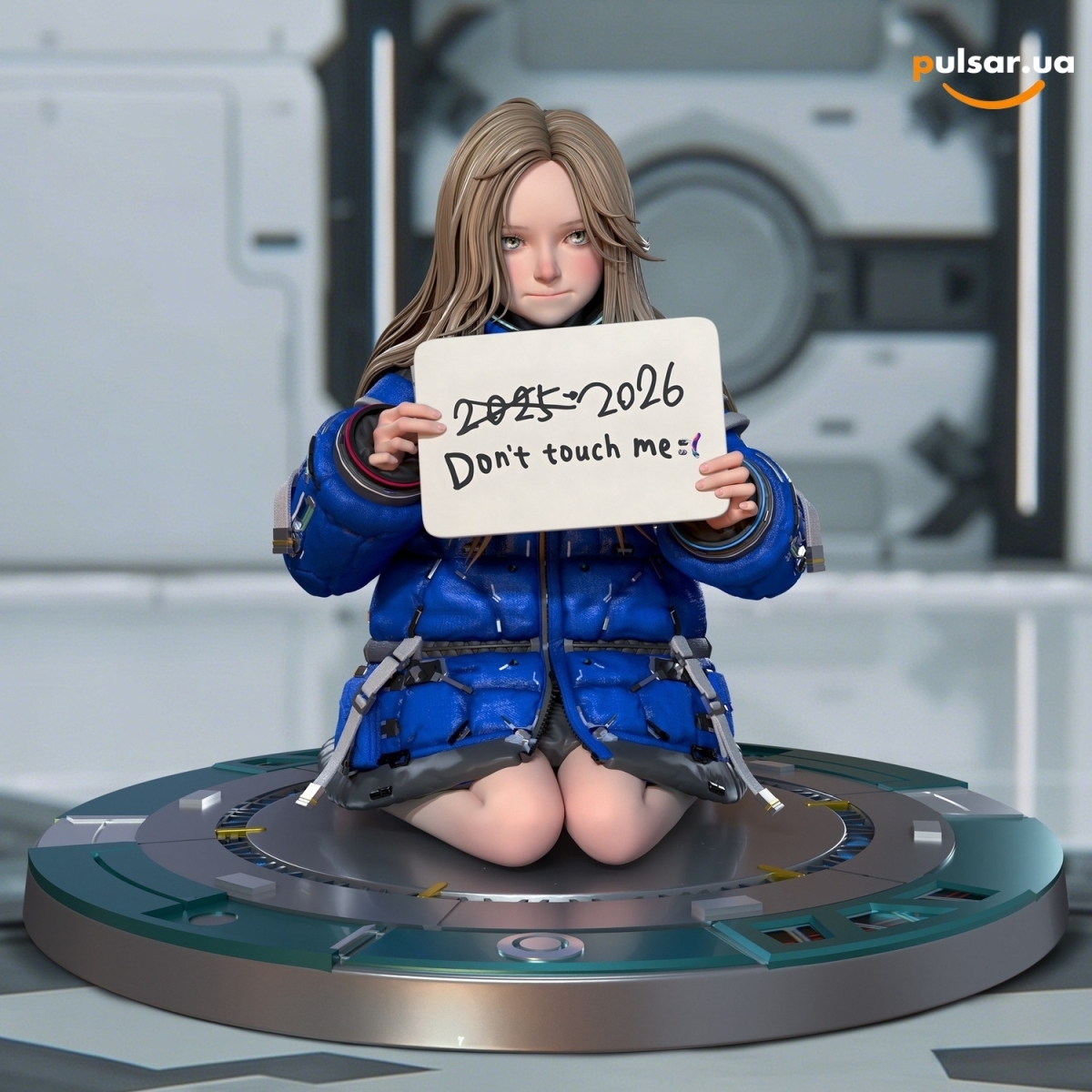 Дівчинка сидить на колінах поверх технологічної круглої платформи. База виконана у вигляді шлюзу космічної станції або футуристичного телепорту. Металеві панелі та вбудовані механізми проліплені з приголомшливою точністю. Глянцевий блиск металевих деталей чудово передає атмосферу просунутого майбутнього.