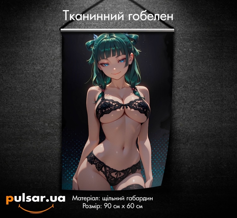 Пронизливий погляд її смарагдових очей, впевнена поза, шикарна мереживна білизна... Це не просто фансервіс, це заява. Величезний розмір та глибокі, насичені кольори роблять цей гобелен не просто прикрасою, а головним акцентом, що розповідає історію про силу та спокусу. Ми в Pulsar з трепетом ставимося до таких складних образів і гарантуємо ідеальну доставку.