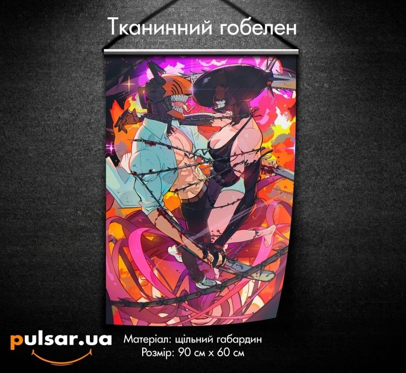 "Танок Диявола Бомби та Людини-Бензопили!" Замовляй цей неймовірно соковитий та динамічний гобелен з Денджі та Резе в Pulsar з доставкою по Києву та Україні!