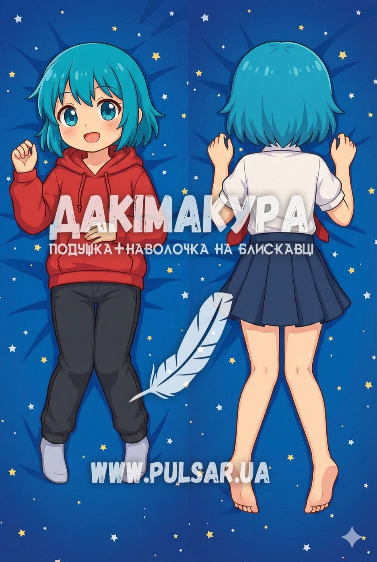 А якщо перевернути подушку (Side B), ти побачиш мене зі спини, одягнену в легку шкільну форму. Я немов ширяю в невагомості, дивлячись у нескінченність всесвіту. Босі ноги, спідниця, що розвівається, і абсолютна свобода. Це образ для тих моментів, коли хочеться просто помовчати, помріяти про майбутній сезон улюбленого тайтла або подумати про вічне. Спокій, гармонія і тиша нічного неба — ось що я хочу подарувати тобі з цього боку.